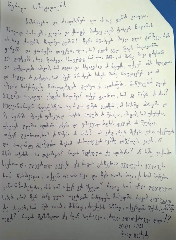 მოწყალების დღეს ყველაზე არაკაცური ქმედება ჩაიდინეთ! თქვენ გგონიათ, რომ ეგ წამება არ არის? ტელევიზორიდან მაყურებინებთ, თუ როგორ იყინება დედაჩემი ამ საშინელ ამინდში და მე, საკანში მყოფს, ფიზიკურად არაფრის გაკეთება არ შემიძლია იმიტომ, რომ უსუსურია ადამიანი ციხეში და ფიზიკურად არაფრის გაკეთება არ შეუძლია. თქვენ გგონიათ, რომ ეს წამება არ არის?