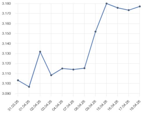 ლარი ბოლო ვაჭრობაზე გაუფასურდა, 0.0037 ლარით და 18 აპრილიდან 3 დღის განმავლობაში 1 ევრო 3.1771 ლარი ეღირება.