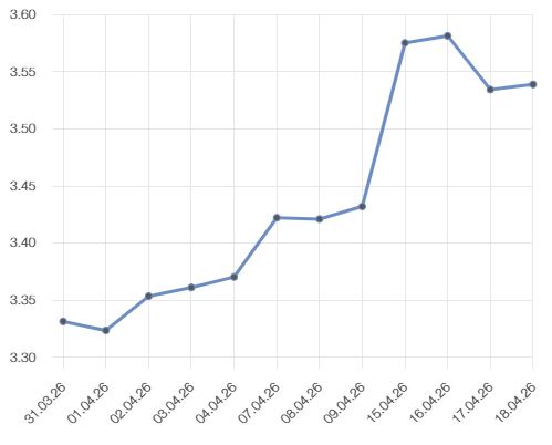 აპრილი ლარის მეტნაკლები სტაბილური კურსით დაიწყო, თუმცა 1 კვირის ევროსთან მიმართებით სახეზე იყო სერიოზული გაუფასურება, რაც ბოლო ვაჭრობებზე ახალ ნიშნულზე დასტაბილურდა. კერძოდ ბოლო 4 ვაჭრობაზე შემდეგი კურსი განისაზღვრა კონკრეტული დღეებისთვის და 1 ევრო ღირდა: