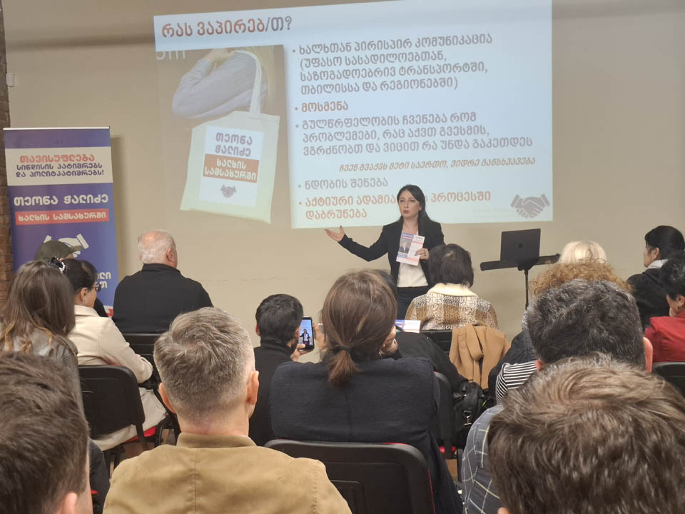 ოპოზიციონერ პოლიტიკოსმა, წლების განმავლობაში სოციალურად დაუცველების (და არა მარტო) ქომაგმა, თეონა ჭალიძემ საზოგადოებას 23 აპრილს თავისი საქმიანობის 1 წლის ანგარიში წარუდგინა. პრეზენტაციაზე დეტალურად იყო განხილული მთელი წლის განმავლობაში განხორციელებული აქტივობები. იყო ემოციური შეფასებები, გაიხსენეს კონკრეტული ფაქტები, პოლიტიკოსის ჩართულობა სხვადასხვა პროექტებში, ღონისძიებებში, საპროტესტო მოძრაობებში: