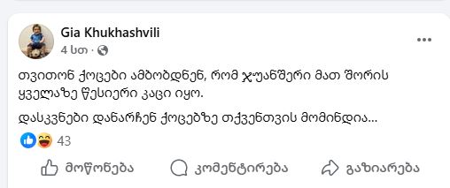 დასკვნები დანარჩენ ქოცებზე თქვენთვის მომინდია…“, – წერს გია ხუხაშვილი ფეისბუქის პირად გვერდზე.