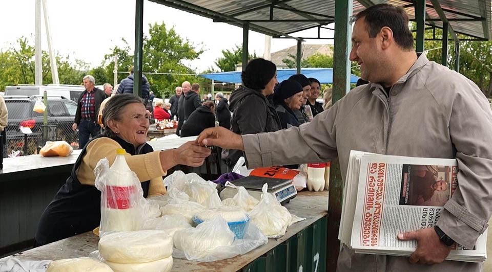 ერთიანი ნაციონალური მოძრაობის ლიდერები და ლევან ხაბეიშვილის მეგობრები ლაშა ფარულავა და ვასო ურუშაძე, სოფ. მუხრანში, ბაზარში მოსახლეობას შეხვდნენ, სადაც „ერთიანი ნაციონალური მოძრაობის“ გაზეთებთან ერთად, 4 ოქტომბრის მოსაწვევები დაარიგეს.