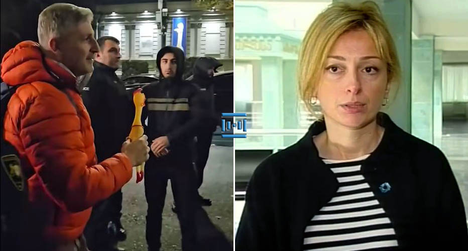 ინფორმაციისთვის: ვანო სხირტლაძე ჭყვიტინა სათამაშო მამლით, პროტესტს გამოხატავდა პოლიციის კორდონთან.